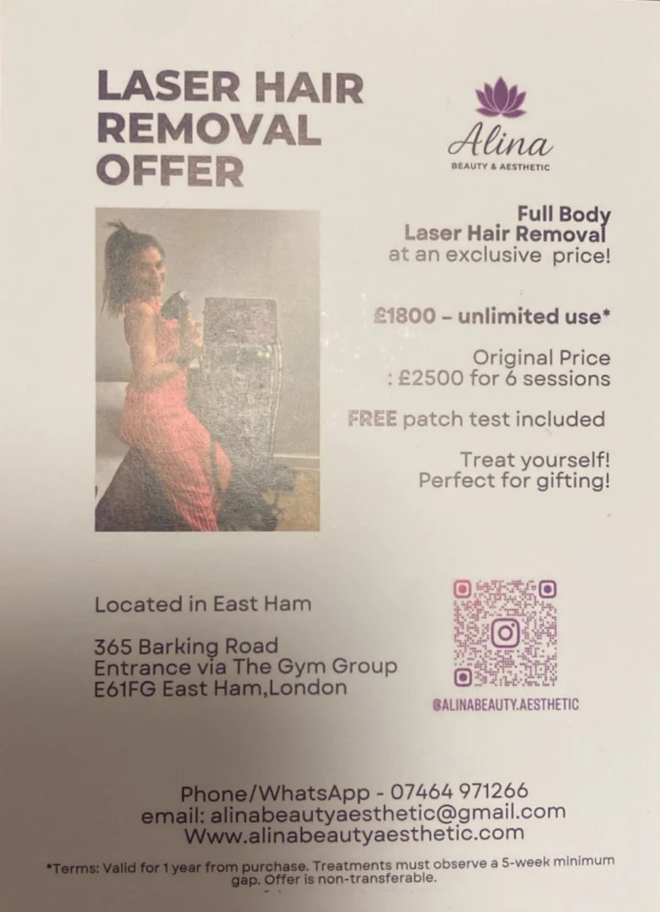 Looking for the best beauty salon offers in East Ham? At Alina Beauty Aesthetic, we believe self-care should be both effective and affordable. That’s why we regularly bring you exclusive salon deals on advanced skincare, hair removal, and beauty treatments. Our current promotion gives you up to 40% OFF on a wide range of services – so you can look and feel your best without overspending.